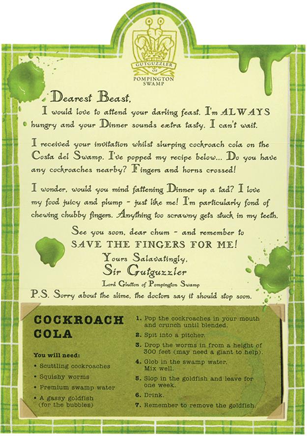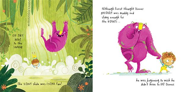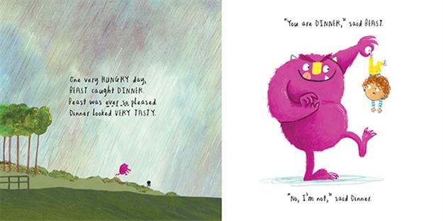 Beast – a beast – plans to eat Dinner – a little boy – at a big feast and sends invitations to all his beastly friends. Readers open the foldout RSVPs to find that everyone is coming (though some do have special dietary requirements)! But don’t worry about Dinner; he’s already got a plan to escape being… dinner.