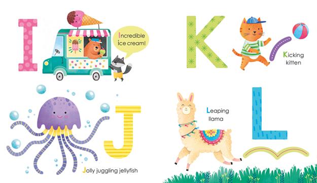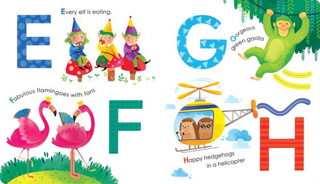 Meet an alligator with an accordion, a bear in a bubble bath, some fabulous flamingos with fans, and much more in this charming introduction to the alphabet. Gorgeous illustrations, irresistible finger trails and alphabetical text combine to make this a perfect book to help very young children learn capital letter shapes and the sounds associated with them.