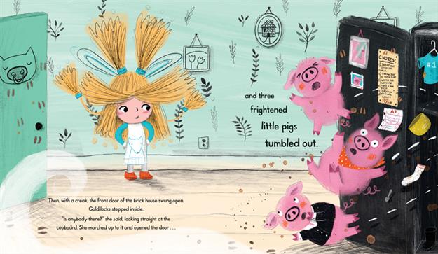 When she knocks on the door of their brick house, Goldilocks is not the visitor the Three Little Pigs were expecting. But before long, the Big Bad Wolf arrives.