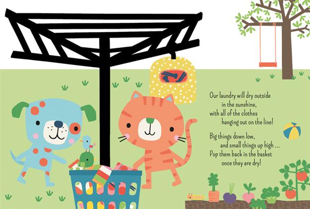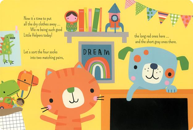 Empty the washing machine, hang out the clothes, then decide where to put them away while learning concepts, from colors, patterns, and shapes, to numbers and opposites. Develop fine motor skills using the ten fuzzy felt pieces that tuck away securely in an attached envelope for storage.