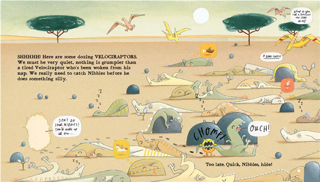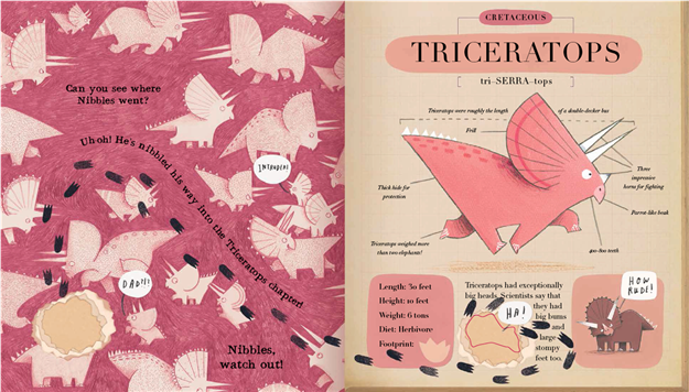 Little ones will love trying to find the culprit – Nibbles – hiding among their favorite, easily recognizable dinosaurs. Is he an herbivore? A carnivore? Or … a bookivore?