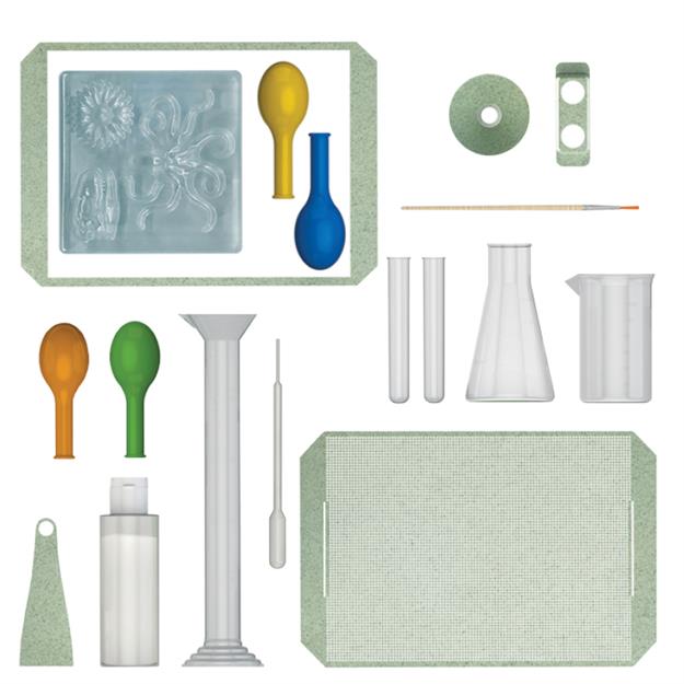 Includes a graduated cylinder, 120 mL beaker, Erlenmeyer flask, test tubes and test tube stand, papermaking deckle and frame, large and small bioplastic-forming trays, spatula, shape molds, pipette, 4 Latex Balloons, 100 mL of glycerin for making bioplastics, funnel, and paintbrush.