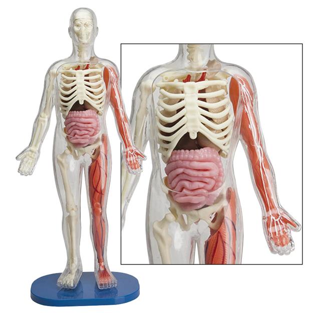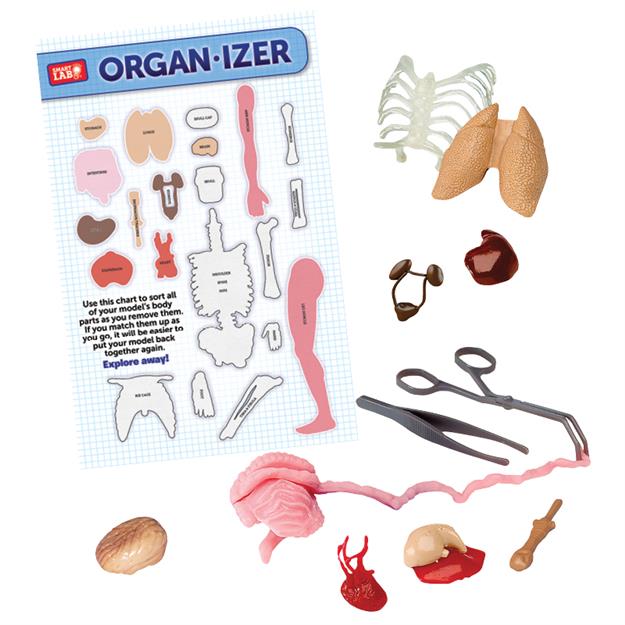 Includes two-piece clear plastic human body model with a stand, 9 removable squishy organs, 12 removable hard plastic bones & muscles, forceps, tweezers, body part Organ-Izer sheet, instructions sheet, and a 24-page illustrated Anatomy Book.