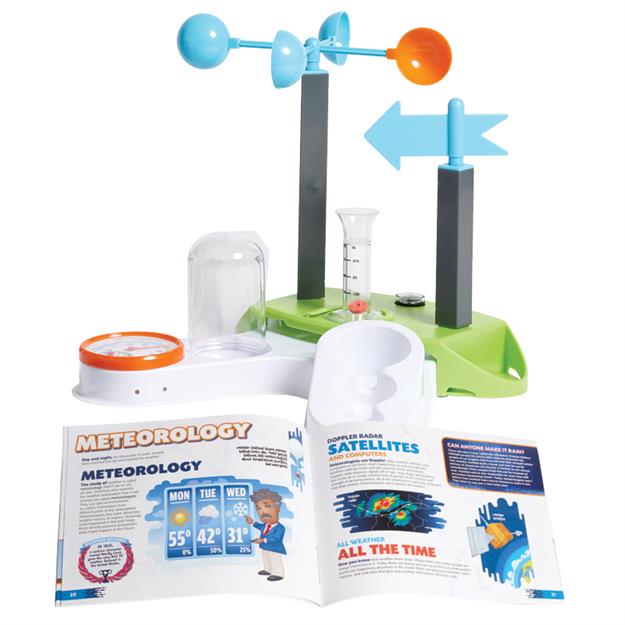 Includes base station, rain gauge, weathervane, compass, anemometer, thermometer, hygrometer, condensation test tube, and a 32-page illustrated book.