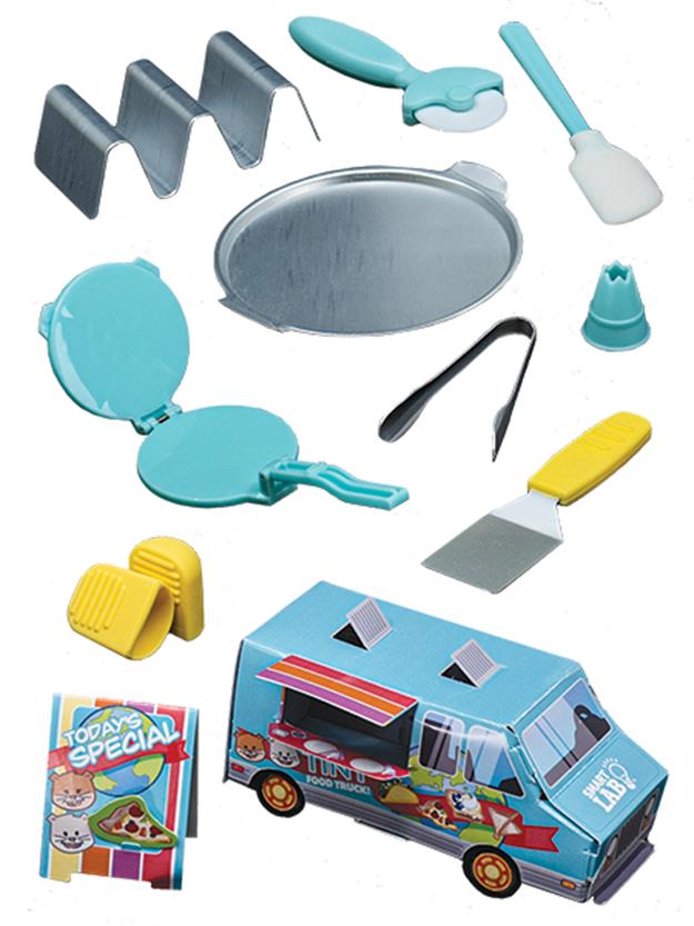 Includes: tortilla press, taco rack, pizza/crepe pan, pizza cutter, spatula, turner, tongs, piping tip, pastry bag, 2 silicone finger mitts, 10 food wraps, papercraft food truck and menu board, and illustrated fold-out recipe sheet with 20 recipes.