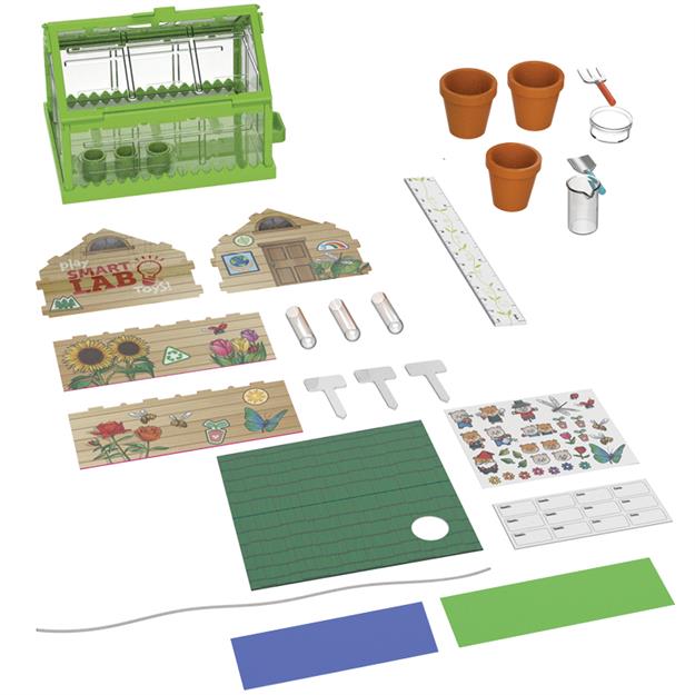 Includes 8-piece miniature greenhouse, 3 tiny pots, 3 tiny test tubes, tiny hand shovel, tiny hand fork, tiny beaker, 3 tiny garden markers, illustrated greenhouse roof and wall panels, string for hydroponic watering, a tiny ruler to measure your plants as they grow, petri dish, green and blue filters, decorative clings, marker stickers, and an illustrated 48-page book with 20 science experiments and explanations.