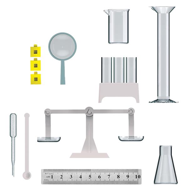 Includes metal storage tin, 3 test tubes, test tube stand, beaker, Erlenmeyer flask, graduated cylinder, funnel, petri dish with lid, balance scale and 3 1-gram weights, magnifier, stainless steel ruler, pipette, measuring scoop, and illustrated 48-page book with 20 science experiments and explanations.